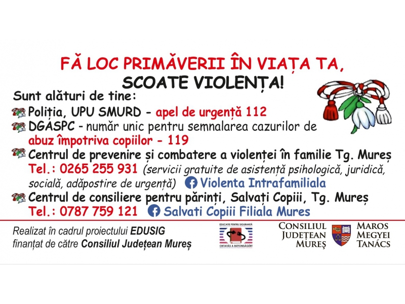 Și în acest an, în județul Mureș, debutul anotimpului de primăvară coincide cu cel al campaniei locale de prevenire a violenței domestice, „Distribuie primăvară, oferă speranţă!”