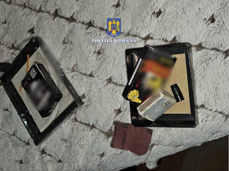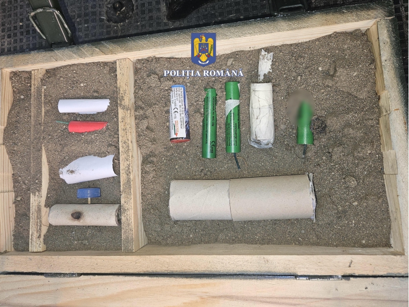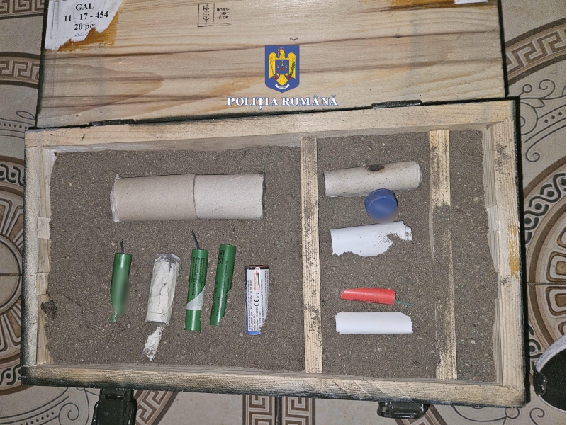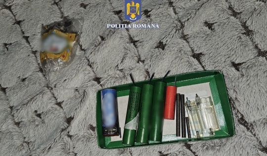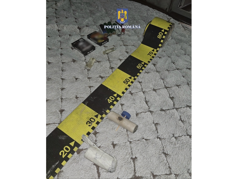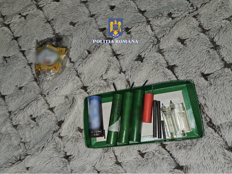 La percheziție, polițiștii au descoperit și ridicat în vederea continuării cercetărilor două petarde confecționate artizanal, un aruncător de proiectile artizanal, nouă articole pirotehnice din categoria F4, respectiv P1, un plic cu praf cu efect de fum, două pungi cu bile metalice, un cântar electric, precum și alte bunuri de interes în cauză.